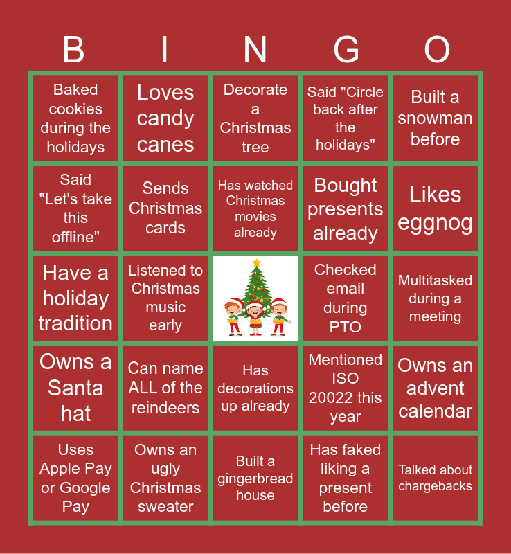 This bingo card has a free space and 24 words: Can name ALL of the reindeers, Owns an ugly Christmas sweater, Has watched Christmas movies already, Uses Apple Pay or Google Pay, Built a snowman before, Baked cookies during the holidays, Said "Let's take this offline", Loves candy canes, Checked email during PTO, Has decorations up already, Bought presents already, Have a holiday tradition, Mentioned ISO 20022 this year, Owns an advent calendar, Sends Christmas cards, Has faked liking a present before, Multitasked during a meeting, Decorate a Christmas tree, Likes eggnog, Listened to Christmas music early, Talked about chargebacks, Owns a Santa hat, Said "Circle back after the holidays" and Built a gingerbread house.