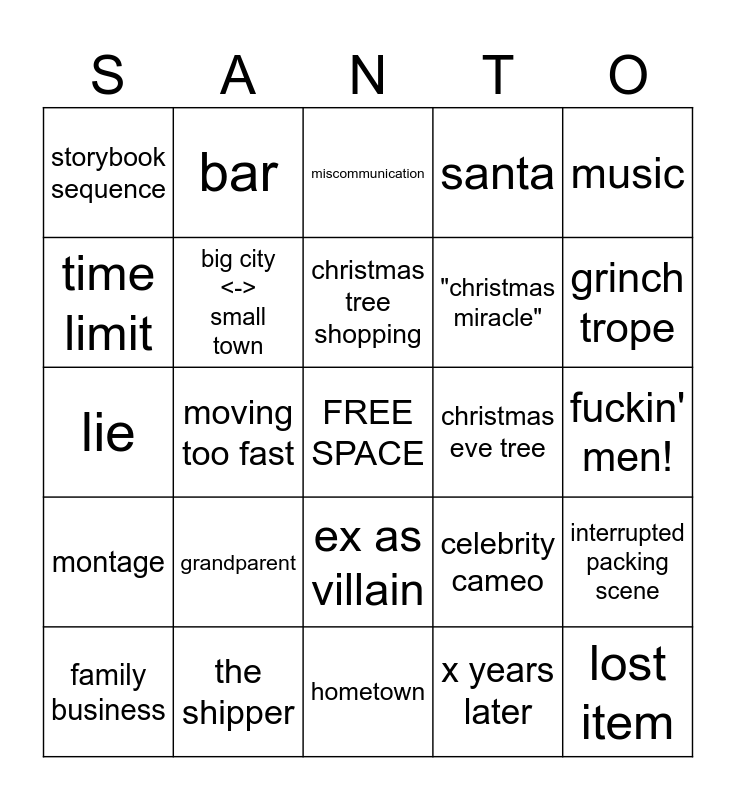 This bingo card has a free space and 43 words: meet cute, lost item, suburban, family business, cheesy nickname, x years later, miscommunication, religion, music, the shipper, santa, christmas eve tree, ex as villain, grandparent, family disapproves, hometown, car trouble, lie, special gift, grinch trope, bar, mistletoe kiss, town event, storybook sequence, dead parent, fuckin' men!, slapstick, dated reference, celebrity cameo, montage, social disaster, interrupted packing scene, bathroom conversation, moving too fast, overbearing mother, product placement, weirdly supernatural, christmas tree shopping, time limit, "christmas miracle", baked goods, big city <-> small town and rural.