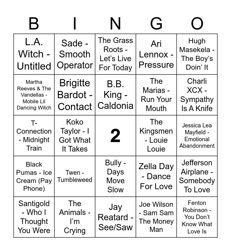 This bingo card has a free space and 75 words: Tommy James & The Shondells - I Think We’re Alone Now, Love - My Little Red Book, The Grass Roots - Let’s Live For Today, The Modern Lovers - Roadrunner, The Rolling Stones - (I Can’t Get No) Satisfaction, Etta James - Leave Your Hat On, Jimmy Reed - Good Lover, Little Walter - Too Late, Chuck Berry - No Particular Place To Go, Little Richard - The Girl Can’t Help It, Barbara Lynn - Second Fiddle Girl, Howlin’ Wolf - Do The Do, B.B. King - Caldonia, Martha Reeves & The Vandellas - Mobile Lil Dancing Witch, Otis Redding - Let Me Come On Home, Koko Taylor - I Got What It Takes, The Animals - I’m Mad Again, Fenton Robinson - You Don’t Know What Love Is, Buddy Miles Express -Wrap It Up, Hugh Masekela - The Boy’s Doin’ It, Ray Charles - What’d I Say, T-Connection - Midnight Train, Brigitte Bardot - Contact, Sade - Smooth Operator, Ari Lennox - Pressure, Rihanna - Say It, Lana Del Rey - Diet Mountain Dew, Television - See No Evil, Kali Uchis - Moonlight, Amy Winehouse - Amy Amy Amy, Shelly Fisher - I’ll Leave You Girl, Dehd - Necklace, Kate Bush - Hounds Of Love, Zella Day - Dance For Love, Charli XCX - Sympathy Is A Knife, The Marias - Run Your Mouth, Nancy Sinatra - These Boots Are Made For Walking, Ray Charles - Hit The Road Jack, Jessica Lea Mayfield - Emotional Abandonment, Joe Wilson - Sam Sam The Money Man, The Beginning Of The End - Super Woman, Curtis Harding - Need Your Love, Betty Harris - Bad Luck, Sir Chloe - Know Better, The Beatles - I’m Only Sleeping, Alvvays - Pimsoll Punks, Santigold - Who I Thought You Were, L.A. Witch - Untitled, Hurray For The Riff Raff - Living In The City, Ashanti - Foolish, The Shirelles - Get Rid Of Him, Bully - Days Move Slow, Lil Yachty - drive ME crazy!, The Exbats - I Was In Your Video, Arlo Parks - Dog Rose, Upchuck - Facecard, Rihanna - There’s A Thug In My Life, SZA - Kill Bill, The Beatles - Drive My Car, Four Tops - I Can’t Help Myself, Twen - Tumbleweed, Kirby - Penny, Tom Petty - Don’t Come Around Here No More, Fleetwood Mac - What Makes You Think You’re The One, Amyl And The Sniffers - U Should Not Be Doing That, The Kingsmen - Louie Louie, Cults - Always Forever, Djo - Basic Being Basic, The Paranoyds - Lizzie, Jefferson Airplane - Somebody To Love, Black Pumas - Ice Cream (Pay Phone), The Animals - I’m Crying, Anna Karina - Roller Girl, Jay Reatard - See/Saw and Clarence Carter - Slip Away.