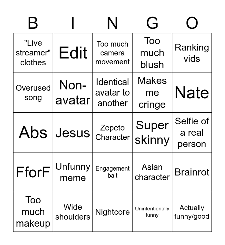 This bingo card has a free space and 29 words: Too much makeup, Asking to date or something, Jesus, Chibi, "Live streamer" clothes, Too much camera movement, Non-avatar, Unfunny meme, Super skinny, Wide shoulders, Selfie of a real person, Actually funny/good, Nightcore, Unintentionally funny, Nate, Diseased avatar, Engagement bait, FforF, Ranking vids, Abs, Asian character, No song, Makes me cringe, Overused song, Too much blush, Edit, Brainrot, Identical avatar to another and I ____ you trend.
