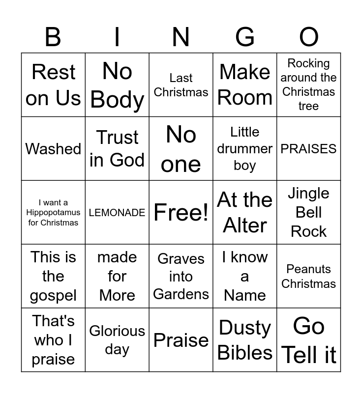 This bingo card has a free space and 34 words: That's who I praise, Dusty Bibles, Have yourself a merry little Christmas, Goodbye Yesterday, This is the gospel, Trust in God, Rocking around the Christmas tree, That's who I praise, No Body, Mary, Did you know?, No one, Last Christmas, What a God, Rest on Us, At the Alter, PRAISES, Glorious day, I want a Hippopotamus for Christmas, made for More, I know a Name, Graves into Gardens, PRAISE YOU ANYWHERE, Rest on Us, Jingle Bell Rock, Praise, Go Tell it, Make Room, All I want for Christmas is you, Little drummer boy, Washed, Christmas Morning, LEMONADE, Peanuts Christmas and The Prodigal.