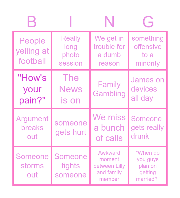 This bingo card has 16 words: Someone fights someone, Someone gets really drunk, We get in trouble for a dumb reason, People yelling at football, Argument breaks out, Really long photo session, We miss a bunch of calls, Awkward moment between Lilly and family member, "How's your pain?", The News is on, Someone storms out, something offensive to a minority, someone gets hurt, James on devices all day, Family Gambling and "When do you guys plan on getting married?".