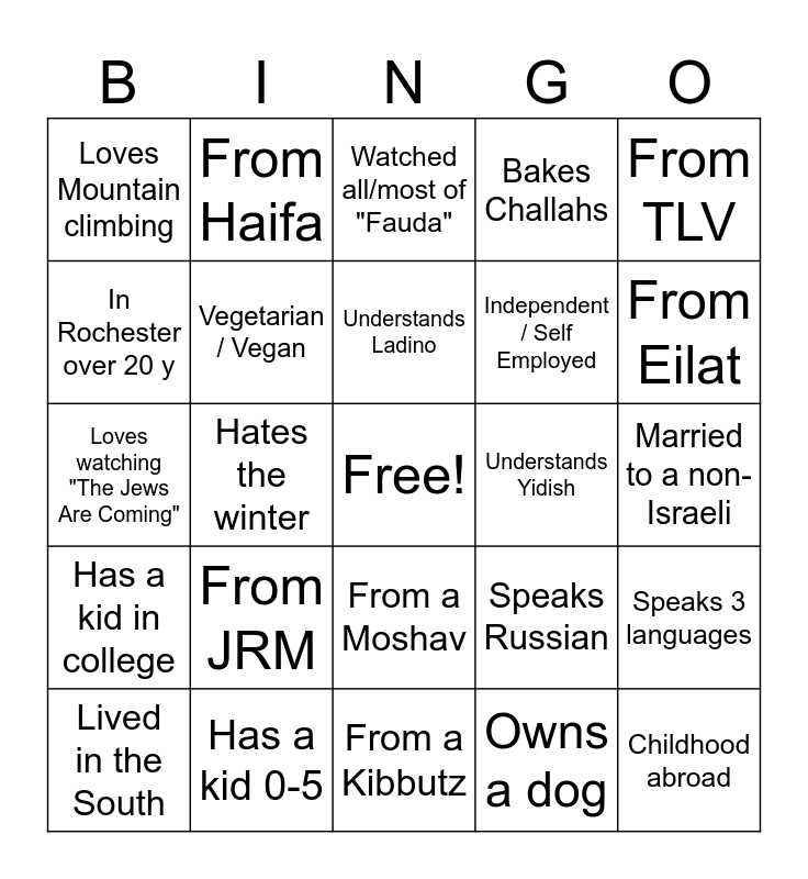 This bingo card has a free space and 49 words: Relocation for work, Childhood abroad, Participate in a Youth Movement, From a Kibbutz, From JRM, Master from an Israeli Uni., From Haifa, Served in the NACHAL, In Rochester over 20 y, In the US less than 2-y, Vegetarian / Vegan, Bakes Challahs, Speaks 3 languages, Speaks Russian, Works at the UR / RIT, Understands Arabic, Understands Ladino, Understands Yidish, Allergic to Amba, From TLV, Hates the winter, Owns a dog, Loves Mountain climbing, Independent / Self Employed, Scuba diver, From Eilat, Lived in the South, Lived in the Galilee, From a Moshav, Has a kid in college, Loves camping, Been to Thailand, Rides a motorcycle, Enjoys sailing (any vessel), Has a kid 0-5, Plays an instrument, Amateur chef, Been to Australia, Married to a non-Israeli, Met in Rochester acquaintances from Israel, Works/ed as an educator, Been to Canada this summer, Hadn't been to Israel in a year, Been to Israel x10 in the past 5 years, Loves watching "The Jews Are Coming", Watched all/most of "Fauda", Loves watching the Eurovision, Shops at the Rochester Public Market and Lives outside of Brighton / Pittsford.