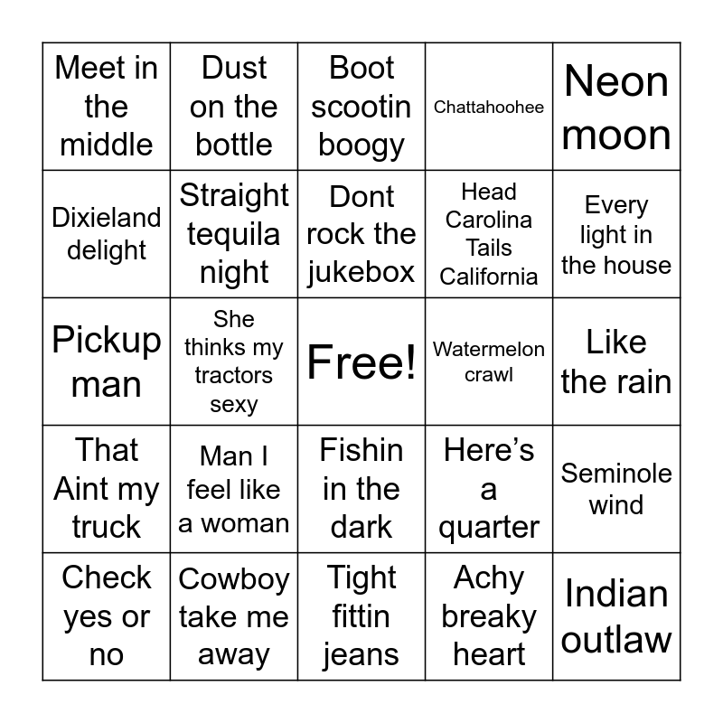 This bingo card has a free space and 24 words: Man I feel like a woman, Cowboy take me away, Dont rock the jukebox, Check yes or no, Neon moon, Meet in the middle, Dixieland delight, Dust on the bottle, Watermelon crawl, Fishin in the dark, Head Carolina Tails California, Pickup man, Here’s a quarter, Seminole wind, Straight tequila night, Achy breaky heart, Like the rain, Boot scootin boogy, Every light in the house, She thinks my tractors sexy, Indian outlaw, That Aint my truck, Chattahoohee and Tight fittin jeans.