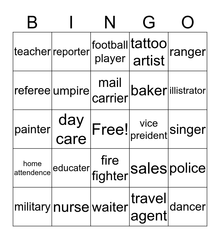 This bingo card has a free space and 24 words: educater, nurse, mail carrier, military, ranger, teacher, referee, reporter, vice preident, fire fighter, baker, painter, sales, police, umpire, travel agent, singer, football player, illistrator, day care, dancer, home attendence, tattoo artist and waiter.