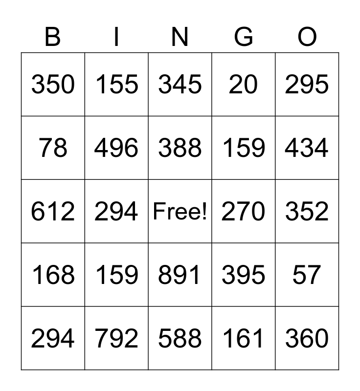 This bingo card has a free space and 49 words: 644, 360, 11, 588, 159, 190, 155, 312, 78, 129, 496, 20, 57, 395, 68, 651, 388, 270, 378, 295, 294, 161, 350, 159, 70, 434, 294, 448, 891, 168, 267, 50, 340, 224, 792, 408, 120, 304, 352, 138, 135, 95, 234, 135, 612, 345, 279, 637 and 112.