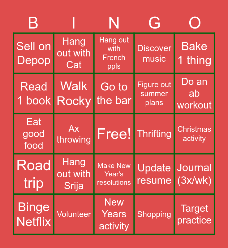 This bingo card has a free space and 24 words: Hang out with Srija, Volunteer, Go to the bar, Binge Netflix, Bake 1 thing, Sell on Depop, Read 1 book, Hang out with Cat, Thrifting, Make New Year's resolutions, Figure out summer plans, Eat good food, Update resume, Journal (3x/wk), Walk Rocky, Shopping, Christmas activity, Hang out with French ppls, Do an ab workout, Ax throwing, Target practice, Road trip, Discover music and New Years activity.