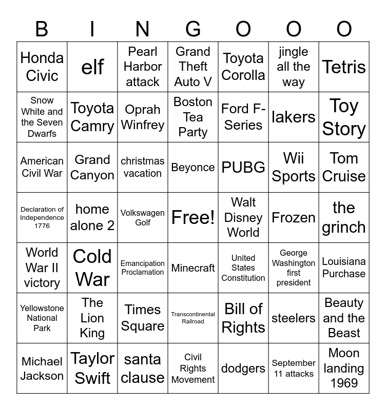 This bingo card has a free space and 49 words: steelers, lakers, dodgers, home alone 2, christmas vacation, the grinch, elf, santa clause, jingle all the way, Minecraft, Tetris, Grand Theft Auto V, Wii Sports, PUBG, The Lion King, Frozen, Snow White and the Seven Dwarfs, Toy Story, Beauty and the Beast, Toyota Corolla, Ford F-Series, Volkswagen Golf, Honda Civic, Toyota Camry, Michael Jackson, Oprah Winfrey, Tom Cruise, Taylor Swift, Beyonce, Grand Canyon, Statue of Liberty, Walt Disney World, Yellowstone National Park, Times Square, Declaration of Independence 1776, United States Constitution, George Washington first president, Louisiana Purchase, American Civil War, Emancipation Proclamation, Transcontinental Railroad, World War II victory, Moon landing 1969, Civil Rights Movement, Boston Tea Party, Pearl Harbor attack, Bill of Rights, Cold War and September 11 attacks.