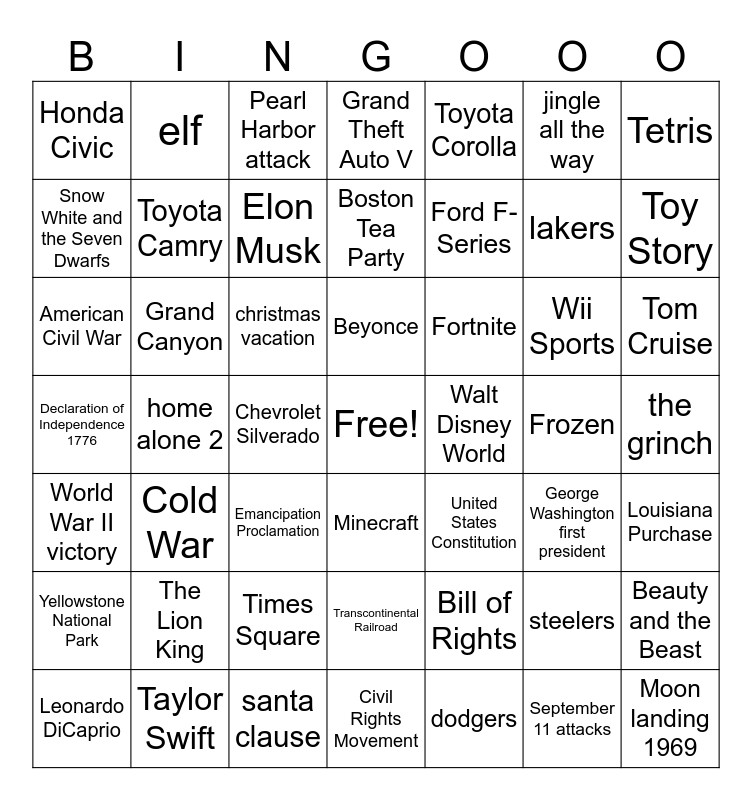 This bingo card has a free space and 49 words: steelers, lakers, dodgers, home alone 2, christmas vacation, the grinch, elf, santa clause, jingle all the way, Minecraft, Tetris, Grand Theft Auto V, Wii Sports, Fortnite, The Lion King, Frozen, Snow White and the Seven Dwarfs, Toy Story, Beauty and the Beast, Toyota Corolla, Ford F-Series, Chevrolet Silverado, Honda Civic, Toyota Camry, Leonardo DiCaprio, Elon Musk, Tom Cruise, Taylor Swift, Beyonce, Grand Canyon, Statue of Liberty, Walt Disney World, Yellowstone National Park, Times Square, Declaration of Independence 1776, United States Constitution, George Washington first president, Louisiana Purchase, American Civil War, Emancipation Proclamation, Transcontinental Railroad, World War II victory, Moon landing 1969, Civil Rights Movement, Boston Tea Party, Pearl Harbor attack, Bill of Rights, Cold War and September 11 attacks.