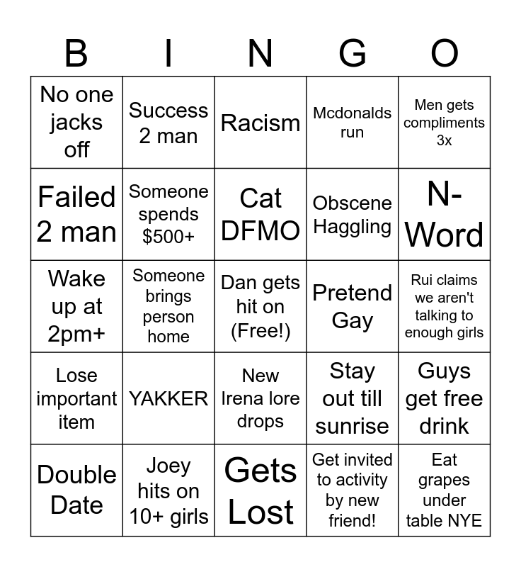 This bingo card has a free space and 24 words: YAKKER, Joey hits on 10+ girls, Cat DFMO, Double Date, Men gets compliments 3x, No one jacks off, Failed 2 man, Success 2 man, Pretend Gay, New Irena lore drops, Obscene Haggling, Wake up at 2pm+, Stay out till sunrise, Guys get free drink, Someone spends $500+, Get invited to activity by new friend!, Rui claims we aren't talking to enough girls, Racism, N-Word, Someone brings person home, Eat grapes under table NYE, Lose important item, Mcdonalds run and Gets Lost.