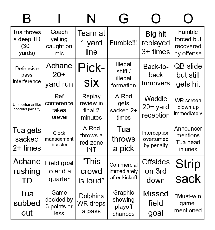 This bingo card has 36 words: Commercial immediately after kickoff, “This crowd is loud”, Graphic showing playoff chances, Defensive pass interference, Tua gets sacked 2+ times, A-Rod gets sacked 2+ times, Achane 20+ yard run, Dolphins WR drops a pass, Big hit replayed 3+ times, Offsides on 3rd down, QB slide but still gets hit, Fumble!!!, Strip sack, Ref conference takes forever, Illegal shift / illegal formation, Tua throws a deep TD (30+ yards), Achane rushing TD, Waddle 20+ yard reception, Unsportsmanlike conduct penalty, Team at 1 yard line, Replay review in final 2 minutes, Clock management disaster, Tua throws a pick, A-Rod throws a red-zone INT, Interception overturned by penalty, Coach yelling caught on mic, Back-to-back turnovers, Game decided by 3 points or less, Pick-six, Fumble forced but recovered by offense, “Must-win game” mentioned, Tua subbed out, Announcer mentions Tua head injuries, WR screen blown up immediately, Field goal to end a quarter and Missed field goal.