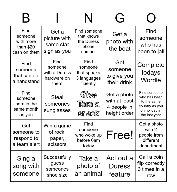 This bingo card has 25 words: Win a game of rock, paper, scissors, Take a photo of an animal, Find someone that speaks 3 languages fluently, Sing a song with someone, Find someone who has been to jail, Find someone with more than $20 cash on them, Find someone that can do a handstand, Get a picture with same star sign as you, Get a photo with at least 4 people in height order, Find someone who woke up before 6am today, Get someone to give you their drink, Find someone born in the same month as you, Free!, Get a photo with 2 people from different department, Find someone with a Duress hardware on them, Call a coin flip correctly 3 times in a row, Find someone who has been to the same country as you on holiday in the last year, Find someone that knows the Duress phone number, Complete todays Wordle, Steal someones sunglasses, Give Tara a snack, Successfully guess someones shoe size, Get someone to respond to a team alert, Get a photo with the boat and Act out a Duress feature.