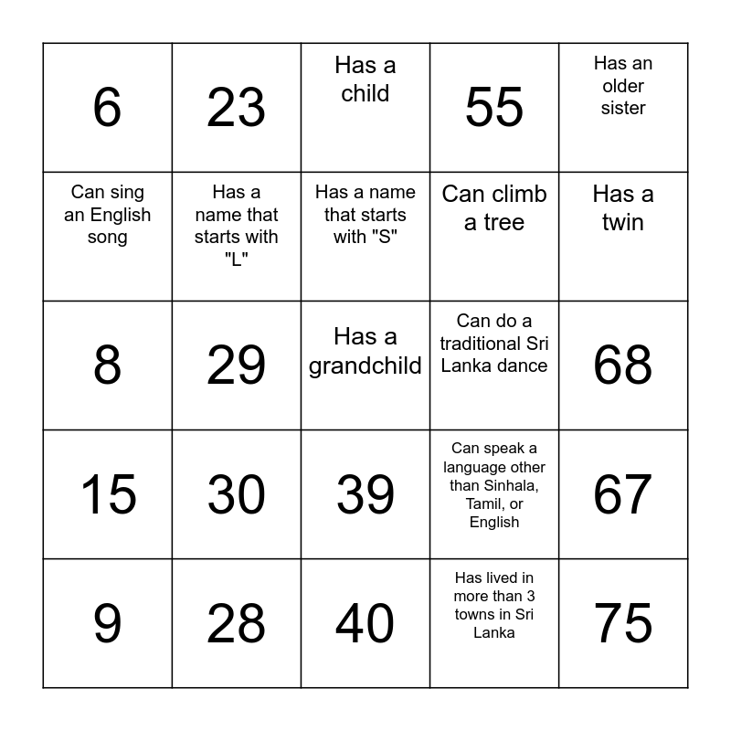This bingo card has a free space and 75 words: Has a pet, Can play an instrument, Has a child, Can swim, Has visited another country, Can ride a bicycle, Has long hair, Has been to Jaffna, Has lived in more than 3 towns in Sri Lanka, Can play carram, Can cook dosa, Can count to ten in Sinhala, English, and Tamil, Can do a traditional Sri Lanka dance, Has a twin, Has a driver's license, Has a name that starts with "L", Can say the ABCs backwards, Can speak a language other than Sinhala, Tamil, or English, Has a three-wheel, Can sing an English song, Can write in cursive (casual writing), Has a name that starts with "S", Can climb a tree, Has an older sister, 6, 21, 35, 51, 66, 7, 22, 36, 52, 67, 8, 23, 37, 53, 68, 9, 24, 38, 54, 69, 10, 25, 39, 55, 70, 11, 26, 40, 56, 71, 12, 27, 41, 57, 72, 13, 28, 42, 58, 73, 14, 29, 43, 59, 74, 15, 30, 44, 60, 75 and 45.
