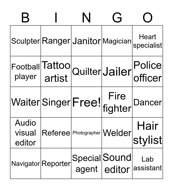 This bingo card has a free space and 24 words: Referee, Reporter, Quilter, Navigator, Heart specialist, Sculpter, Football player, Ranger, Fire fighter, Photographer, Jailer, Waiter, Welder, Hair stylist, Tattoo artist, Sound editor, Dancer, Janitor, Police officer, Singer, Lab assistant, Audio visual editor, Magician and Special agent.