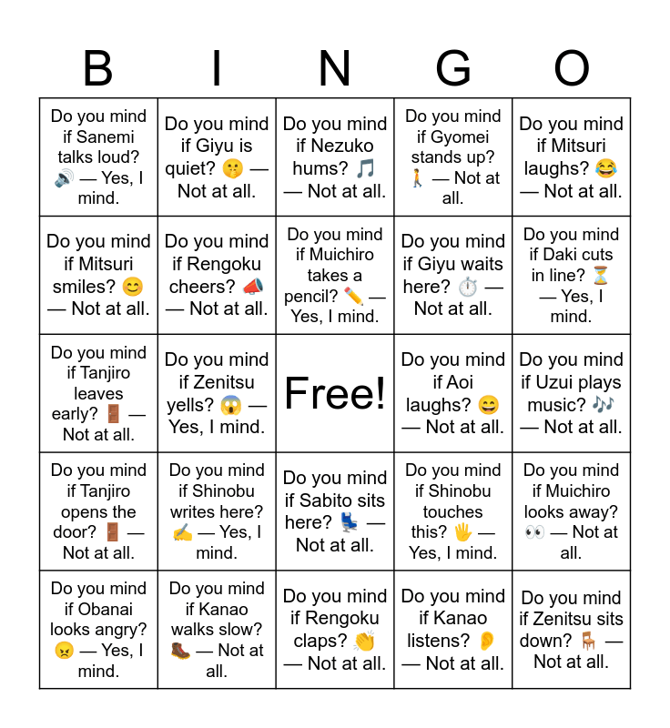 This bingo card has a free space and 33 words: Do you mind if Inosuke burps? ๐ โ Yes, I mind., Do you mind if Inosuke runs? ๐ โ Not at all., Do you mind if Zenitsu yells? ๐ฑ โ Yes, I mind., Do you mind if Genya spits? ๐คข โ Yes, I mind., Do you mind if Tanjiro opens the door? ๐ช โ Not at all., Do you mind if Rengoku cheers? ๐ฃ โ Not at all., Do you mind if Mitsuri laughs? ๐ โ Not at all., Do you mind if Obanai looks angry? ๐ โ Yes, I mind., Do you mind if Giyu is quiet? ๐คซ โ Not at all., Do you mind if Gyomei eats? ๐ฝ๏ธ โ Not at all., Do you mind if Muichiro takes a pencil? โ๏ธ โ Yes, I mind., Do you mind if Nezuko hums? ๐ต โ Not at all., Do you mind if Uzui whistles? ๐ถ โ Yes, I mind., Do you mind if Nezuko knocks? ๐ช โ Not at all., Do you mind if Aoi laughs? ๐ โ Not at all., Do you mind if Daki cuts in line? โณ โ Yes, I mind., Do you mind if Kanao walks slow? ๐ฅพ โ Not at all., Do you mind if Tanjiro leaves early? ๐ช โ Not at all., Do you mind if Shinobu writes here? โ๏ธ โ Yes, I mind., Do you mind if Shinobu touches this? ๐๏ธ โ Yes, I mind., Do you mind if Sabito sits here? ๐บ โ Not at all., Do you mind if Makomo asks a question? โ โ Not at all., Do you mind if Sanemi talks loud? ๐ โ Yes, I mind., Do you mind if Uzui plays music? ๐ถ โ Not at all., Do you mind if Rengoku claps? ๐ โ Not at all., Do you mind if Zenitsu sits down? ๐ช โ Not at all., Do you mind if Gyomei stands up? ๐ถ โ Not at all., Do you mind if Giyu waits here? โฑ๏ธ โ Not at all., Do you mind if Mitsuri smiles? ๐ โ Not at all., Do you mind if Muichiro looks away? ๐ โ Not at all., Do you mind if Aoi cleans up? ๐งน โ Not at all., Do you mind if Kanao listens? ๐ โ Not at all. and Do you mind if Tanjiro helps me? ๐ค โ Not at all..