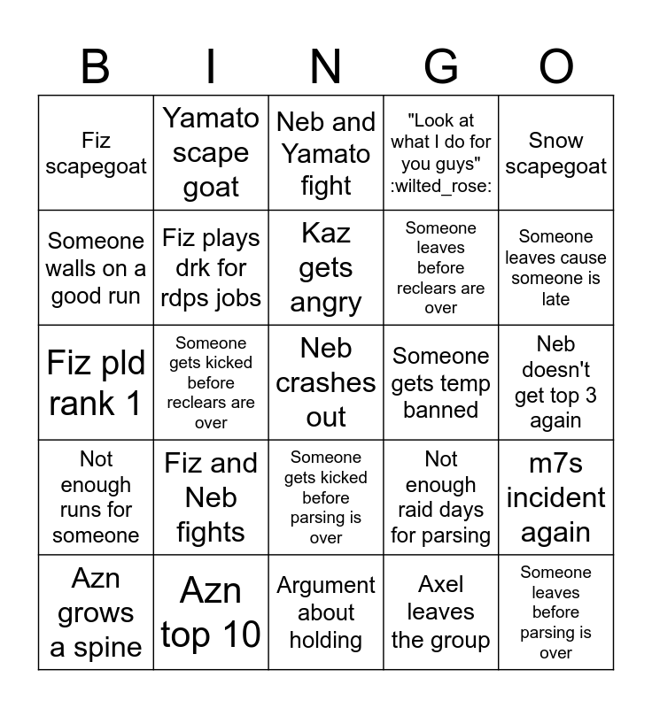 This bingo card has a free space and 24 words: Azn grows a spine, Fiz and Neb fights, Kaz gets angry, Axel leaves the group, Snow scapegoat, Fiz scapegoat, Yamato scape goat, Neb and Yamato fight, Someone gets temp banned, Neb doesn't get top 3 again, Fiz pld rank 1, Fiz plays drk for rdps jobs, Not enough raid days for parsing, m7s incident again, Someone walls on a good run, Azn top 10, Argument about holding, "Look at what I do for you guys" :wilted_rose:, Someone leaves cause someone is late, Not enough runs for someone, Someone gets kicked before reclears are over, Someone gets kicked before parsing is over, Someone leaves before reclears are over and Someone leaves before parsing is over.
