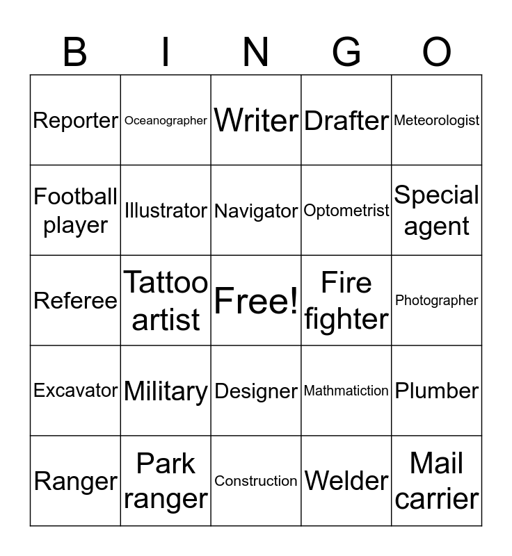 This bingo card has a free space and 24 words: Military, Park ranger, Navigator, Ranger, Meteorologist, Reporter, Football player, Oceanographer, Fire fighter, Designer, Optometrist, Referee, Mathmatiction, Plumber, Illustrator, Welder, Photographer, Writer, Special agent, Tattoo artist, Mail carrier, Excavator, Drafter and Construction.