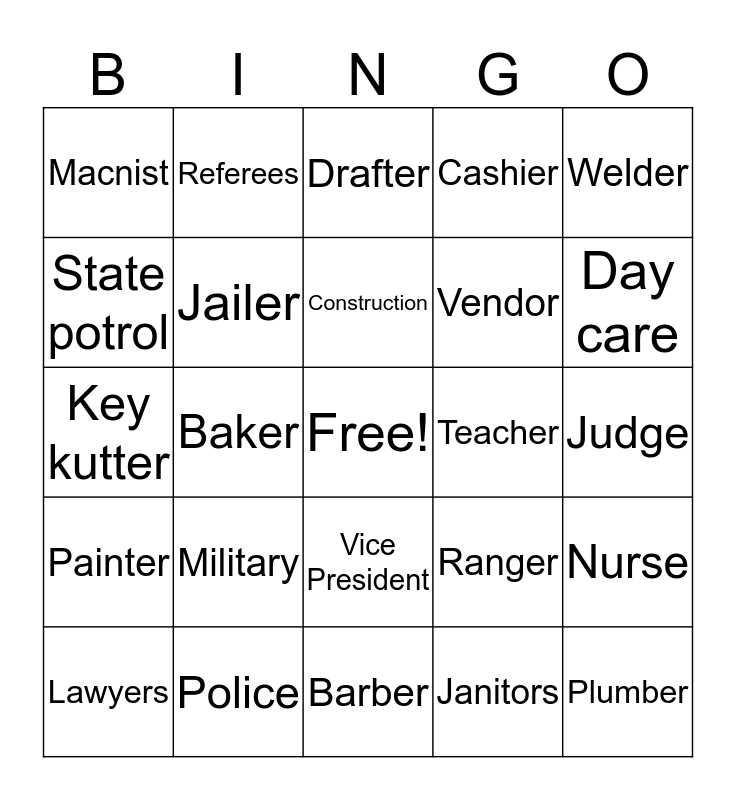 This bingo card has a free space and 24 words: Military, Police, Construction, Lawyers, Welder, Macnist, State potrol, Referees, Teacher, Vice President, Vendor, Key kutter, Ranger, Nurse, Jailer, Janitors, Judge, Drafter, Day care, Baker, Plumber, Painter, Cashier and Barber.