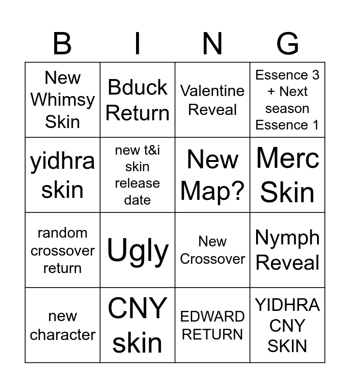 This bingo card has 16 words: CNY skin, Nymph Reveal, Valentine Reveal, New Whimsy Skin, random crossover return, Bduck Return, New Crossover, EDWARD RETURN, yidhra skin, new t&i skin release date, new character, Essence 3 + Next season Essence 1, Ugly, Merc Skin, New Map? and YIDHRA CNY SKIN.