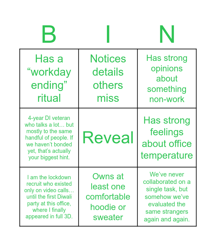 This bingo card has a free space and 8 words: 4-year DI veteran who talks a lot… but mostly to the same handful of people. If we haven’t bonded yet, that’s actually your biggest hint., Notices details others miss, Has strong feelings about office temperature, I am the lockdown recruit who existed only on video calls… until the first Diwali party at this office, where I finally appeared in full 3D., Has strong opinions about something non-work, Has a “workday ending” ritual, Owns at least one comfortable hoodie or sweater and We’ve never collaborated on a single task, but somehow we’ve evaluated the same strangers again and again..