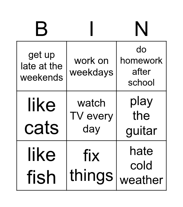 This bingo card has a free space and 14 words: get up early on Saturday, have breakfast at school, like fish, work on weekdays, like cats, hate cold weather, drive a car, usually make breakfast, fix things, get up late at the weekends, speak English, play the guitar, do homework after school and play computer games in the evening.
