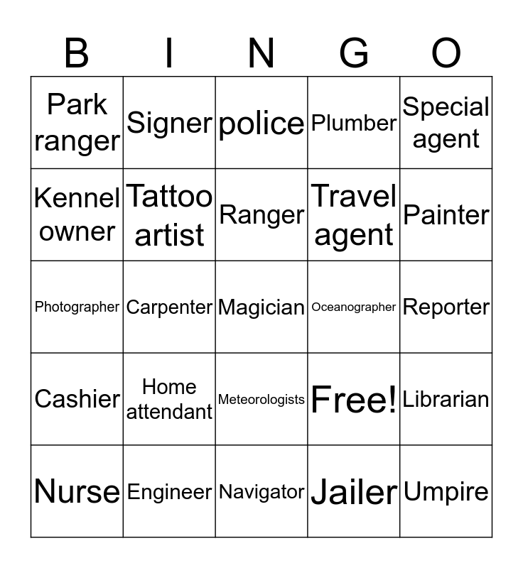 This bingo card has 25 words: Home attendant, Navigator, Ranger, Nurse, Special agent, Park ranger, Kennel owner, Signer, Oceanographer, Meteorologists, Travel agent, Photographer, Free!, Librarian, Tattoo artist, Umpire, Reporter, police, Painter, Carpenter, Magician, Engineer, Cashier, Plumber and Jailer.
