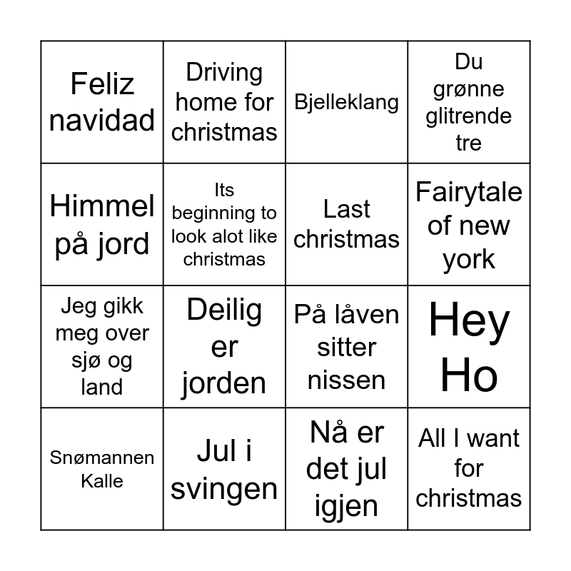This bingo card has 32 words: Musevisa, Snowman, Hey Ho, Tenn lys, All I want for christmas, Last christmas, Himmel på jord, Når snøen smelter, Driving home for christmas, Let it snow, Fairytale of new york, Bjelleklang, O helga natt, Nå tennes tusen julelys, Jul i svingen, Santa lucia, En stjerne skinner i natt, På låven sitter nissen, Julekveldsvisa, Glade jul, Rudolf er rød på nesen, Jeg så mamma kysse nissen, Nå er det jul igjen, Så går vi rundt om en enebærbusk, Snømannen Kalle, Du grønne glitrende tre, Jeg gikk meg over sjø og land, Its beginning to look alot like christmas, Feliz navidad, Rockin around the christmas tree, Santa baby and Deilig er jorden.