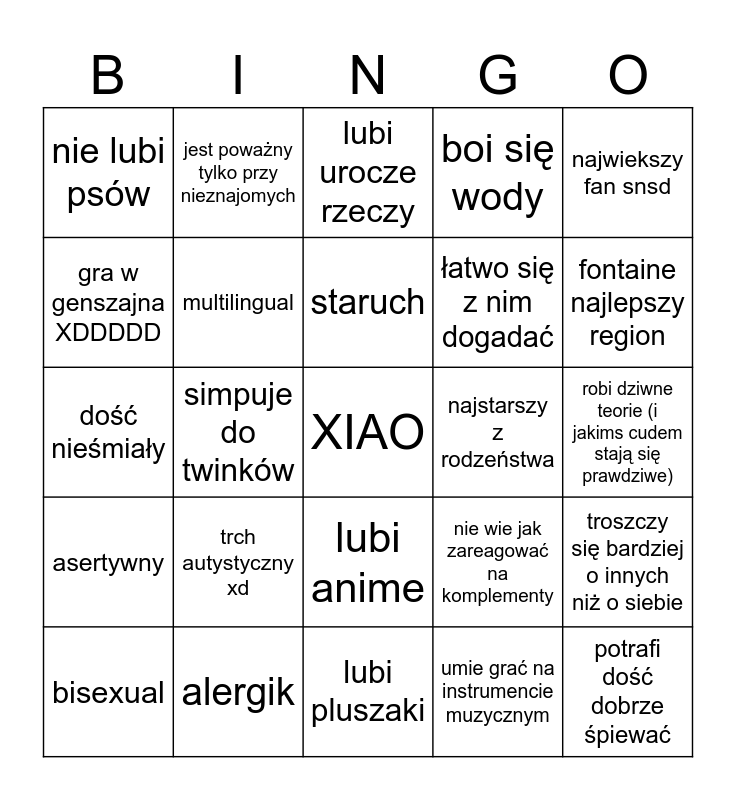 This bingo card has a free space and 24 words: trch autystyczny xd, alergik, staruch, bisexual, najwiekszy fan snsd, nie lubi psów, gra w genszajna XDDDDD, jest poważny tylko przy nieznajomych, najstarszy z rodzeństwa, lubi anime, łatwo się z nim dogadać, dość nieśmiały, nie wie jak zareagować na komplementy, troszczy się bardziej o innych niż o siebie, multilingual, umie grać na instrumencie muzycznym, robi dziwne teorie (i jakims cudem stają się prawdziwe), lubi urocze rzeczy, fontaine najlepszy region, simpuje do twinków, potrafi dość dobrze śpiewać, asertywny, boi się wody and lubi pluszaki.