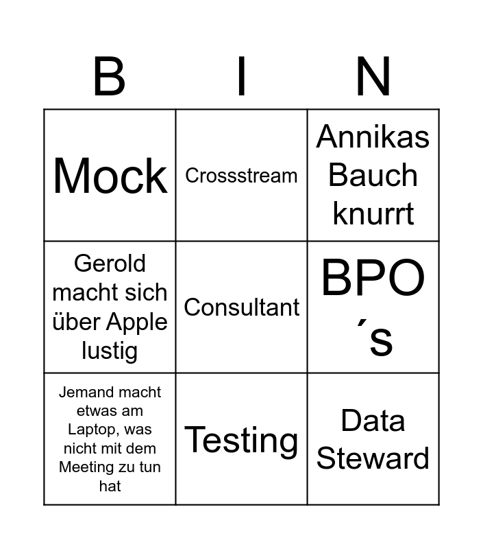 This bingo card has a free space and 24 words: OQ/PQ, End2End, Testing, SolMan, Data Steward, Mock, BPO´s, Crossstream, Gerolds Laptop spinnt, Gerold mag eine Textformulierung nicht, jemand findet den Raum nicht, Wir überziehen um 15 Minuten, mindestens 4 koffeinhaltige Getränke stehen auf dem Tisch, Hr. Thuß spricht ein altes Problem an, was schon gelöst ist, Jemand macht etwas am Laptop, was nicht mit dem Meeting zu tun hat, Hr. Thuß' Handy klingelt, Mario muss eher gehen, Annikas Bauch knurrt, Mario läuft durch den Raum, Julian bekommt Hausaufgaben diktiert, Lisa muss Protokoll schreiben, Die Q-Hub Leute kommen zu spät, Gerold macht sich über Apple lustig and ein Asiatenwitz fällt.
