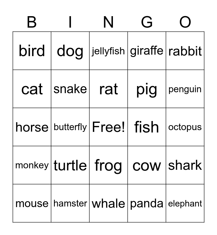 This bingo card has a free space and 24 words: turtle, hamster, rat, mouse, rabbit, bird, cat, dog, fish, frog, pig, horse, cow, shark, snake, panda, octopus, jellyfish, penguin, butterfly, elephant, monkey, giraffe and whale.
