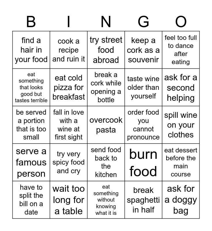 This bingo card has 25 words: try very spicy food and cry, eat something without knowing what it is, break a cork while opening a bottle, have to split the bill on a date, feel too full to dance after eating, find a hair in your food, eat something that looks good but tastes terrible, cook a recipe and ruin it, order food you cannot pronounce, send food back to the kitchen, taste wine older than yourself, be served a portion that is too small, burn food, eat dessert before the main course, eat cold pizza for breakfast, ask for a doggy bag, spill wine on your clothes, try street food abroad, ask for a second helping, fall in love with a wine at first sight, overcook pasta, wait too long for a table, serve a famous person, keep a cork as a souvenir and break spaghetti in half.