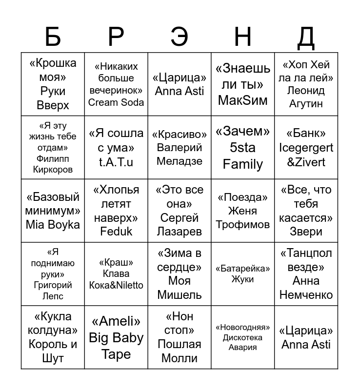 This bingo card has 35 words: «Три белых коня» Сергей Захаров, «У меня появился другой» ВИА ГРА, «Тесно» Aarne, «Я сошла с ума» t.A.T.u, «Зима в сердце» Моя Мишель, «Знаешь ли ты» МакSим, «Я эту жизнь тебе отдам» Филипп Киркоров, «Само собой» Артур Пирожков, «Красиво» Валерий Меладзе, «Шелк» Ваня Дмитриенко, «Базовый минимум» Mia Boyka, «Хоп Хей ла ла лей» Леонид Агутин, «Моя игра» Баста, «Самая самая» Егор Крид, «Крошка моя» Руки Вверх, «Поезда» Женя Трофимов, «Новогодняя» Дискотека Авария, «Хлопья летят наверх» Feduk, «Я поднимаю руки» Григорий Лепс, «Это все она» Сергей Лазарев, «Батарейка» Жуки, «Кукла колдуна» Король и Шут, «Танцпол везде» Анна Немченко, «Ameli» Big Baby Tape, «Царица» Anna Asti, «Банк» Icegergert &Zivert, «Царица» Anna Asti, «Невозможное возможно» Дима Билан, «Зачем» 5sta Family, «Все, что тебя касается» Звери, «Цыпа» Котенок Котэ, «Нон стоп» Пошлая Молли, «Краш» Клава Кока&Niletto, «Никаких больше вечеринок» Cream Soda and «Я свободен» Кипелов.