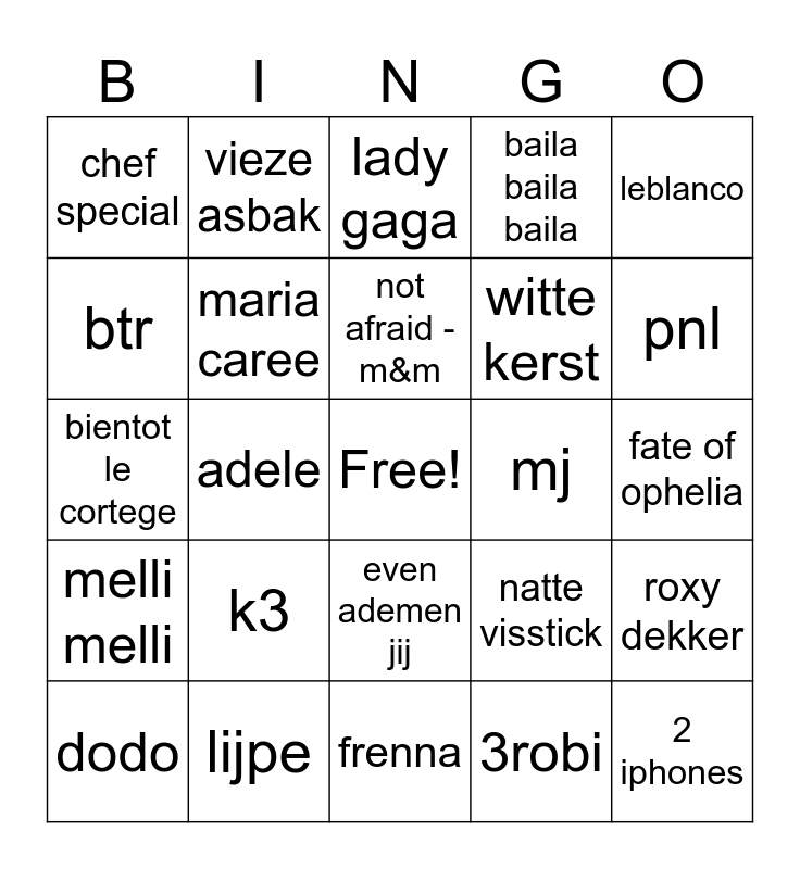 This bingo card has a free space and 24 words: k3, lijpe, not afraid - m&m, dodo, leblanco, chef special, btr, vieze asbak, mj, even ademen jij, witte kerst, bientot le cortege, natte visstick, roxy dekker, maria caree, 3robi, fate of ophelia, lady gaga, pnl, adele, 2 iphones, melli melli, baila baila baila and frenna.
