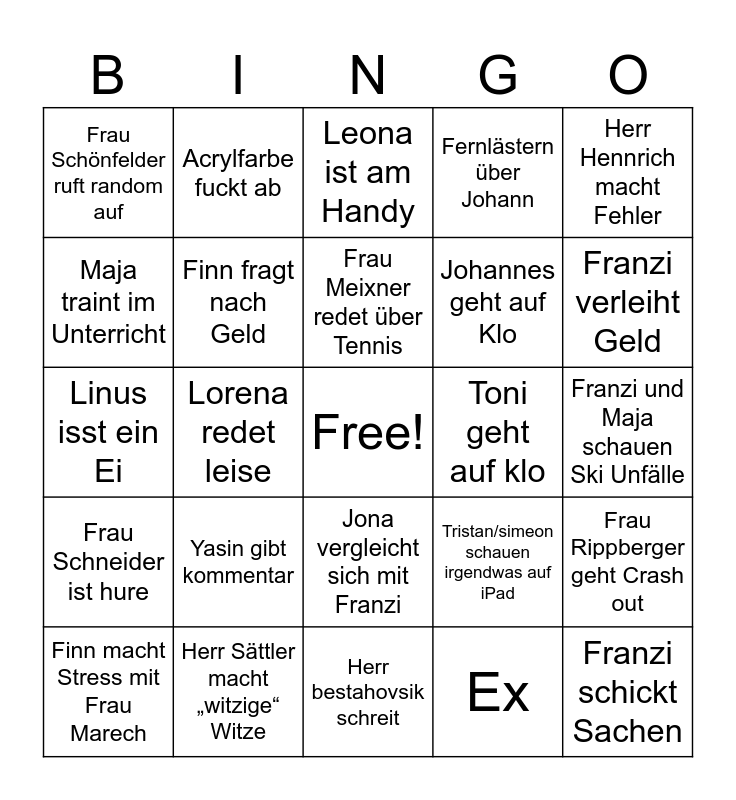 This bingo card has a free space and 24 words: Yasin gibt kommentar, Herr Sättler macht „witzige“ Witze, Frau Meixner redet über Tennis, Finn macht Stress mit Frau Marech, Herr Hennrich macht Fehler, Frau Schönfelder ruft random auf, Maja traint im Unterricht, Acrylfarbe fuckt ab, Toni geht auf klo, Jona vergleicht sich mit Franzi, Johannes geht auf Klo, Linus isst ein Ei, Tristan/simeon schauen irgendwas auf iPad, Frau Rippberger geht Crash out, Finn fragt nach Geld, Ex, Franzi und Maja schauen Ski Unfälle, Leona ist am Handy, Franzi verleiht Geld, Lorena redet leise, Franzi schickt Sachen, Frau Schneider ist hure, Fernlästern über Johann and Herr bestahovsik schreit.