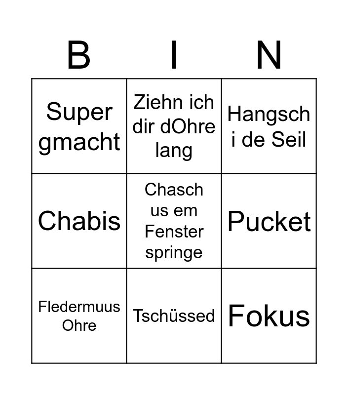 This bingo card has a free space and 8 words: Pucket, Hangsch i de Seil, Ziehn ich dir dOhre lang, Fledermuus Ohre, Super gmacht, Fokus, Chabis and Tschüssed.