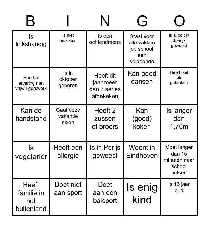 This bingo card has 30 words: Doet niet aan sport, Speelt een instrument, Gaat deze vakantie skiën, Heeft een huisdier, Is linkshandig, Is een ochtendmens, Is in oktober geboren, Is in Parijs geweest, Kan (goed) koken, Doet aan een balsport, Is langer dan 1.70m, Heeft 2 zussen of broers, Is enig kind, Is 13 jaar oud, Heeft ooit iets gebroken, Heeft blauwe ogen, Woont in Eindhoven, Is vegetariër, Heeft een allergie, Is al ooit in Spanje geweest, Kan de handstand, Kan in het frans tot 20 tellen, Is niet muzikaal, Kan goed dansen, Heeft al ervaring met vrijwilligerswerk, Staat voor alle vakken op school een voldoende, Moet langer dan 15 minuten naar school fietsen, Heeft familie in het buitenland, Heeft dit jaar meer dan 3 series afgekeken and Heeft nog nooit gevlogen.