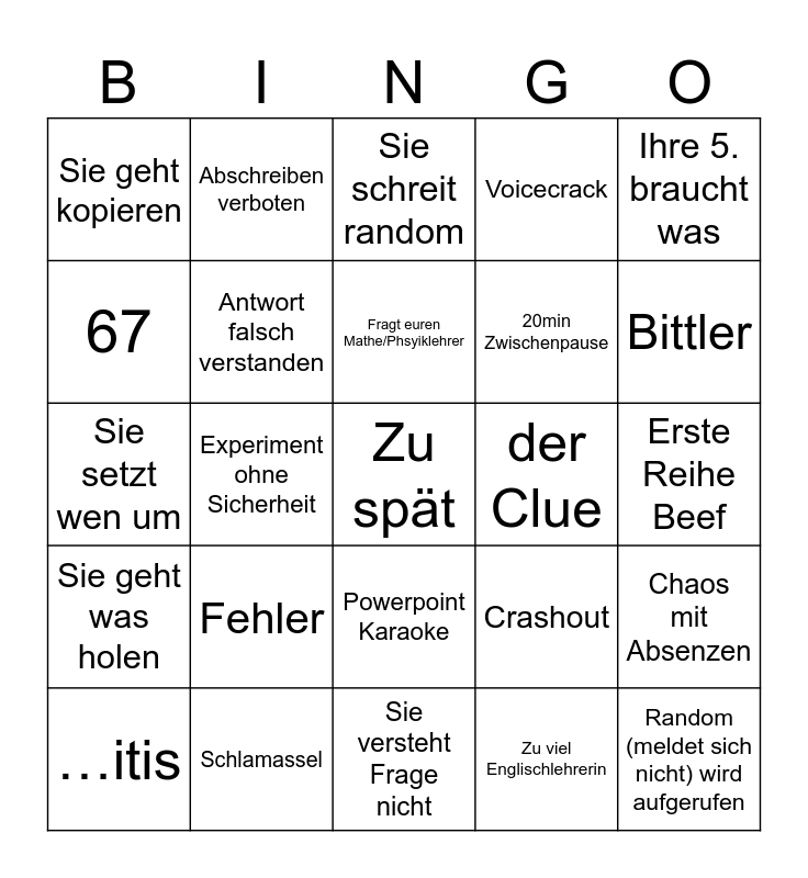 This bingo card has a free space and 24 words: …itis, Fehler, Fragt euren Mathe/Phsyiklehrer, Zu viel Englischlehrerin, Ihre 5. braucht was, Sie geht kopieren, Abschreiben verboten, Sie schreit random, der Clue, Erste Reihe Beef, Sie setzt wen um, Antwort falsch verstanden, Crashout, Chaos mit Absenzen, 67, Schlamassel, Sie versteht Frage nicht, Voicecrack, Bittler, Sie geht was holen, Experiment ohne Sicherheit, Powerpoint Karaoke, 20min Zwischenpause and Random (meldet sich nicht) wird aufgerufen.