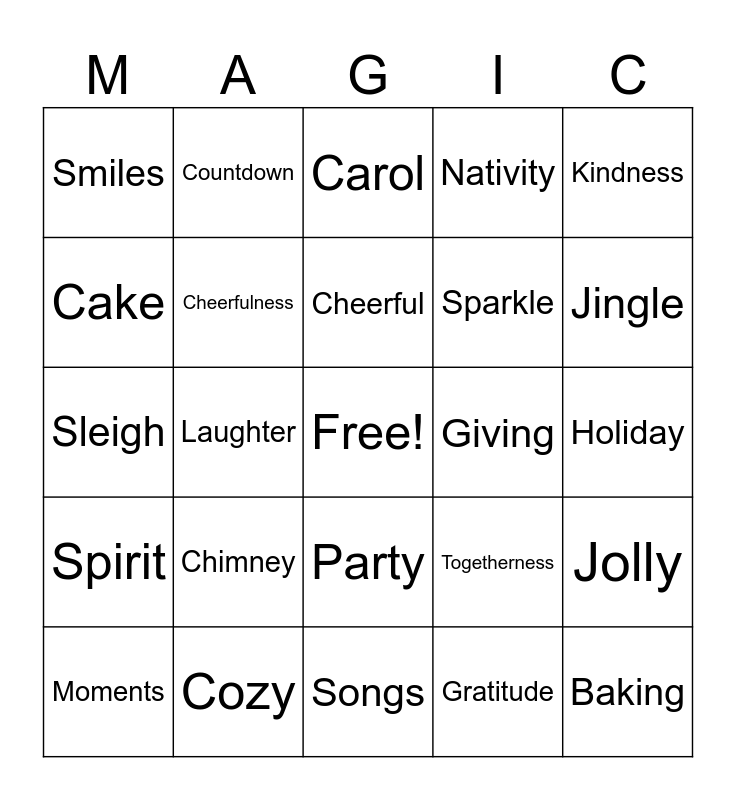 This bingo card has a free space and 100 words: Christmas, Toffee, Holiday, Festive, Joy, Cheer, Celebration, Season, Winter, Snow, Snowflake, Frost, Chill, Cozy, Warmth, Lights, Sparkle, Glow, Twinkle, Magic, Wonder, Miracle, Peace, Love, Hope, Giving, Kindness, Togetherness, Family, Friends, Laughter, Smiles, Happiness, Blessings, Gratitude, Cheerful, Jolly, Merry, Santa, Claus, Reindeer, Snowman, Sleigh, Bells, Jingle, Carol, Carolling, Choir, Music, Songs, Tree, Evergreen, Pine, Ornament, Bauble, Tinsel, Wreath, Star, Angel, Nativity, Crib, Mistletoe, Holly, Ivy, Gifts, Presents, Wrapping, Ribbons, Bows, Surprise, Stocking, Chimney, Fireplace, Cocoa, Chocolate, Cookies, Gingerbread, Cake, Pudding, Feast, Treats, Baking, Workshop, Party, Gathering, Countdown, Midnight, Eve, December, Spirit, Tradition, Customs, Memories, Moments, Cheerfulness, Festivity, Unity, Jinglebells, eggnog and Luck.