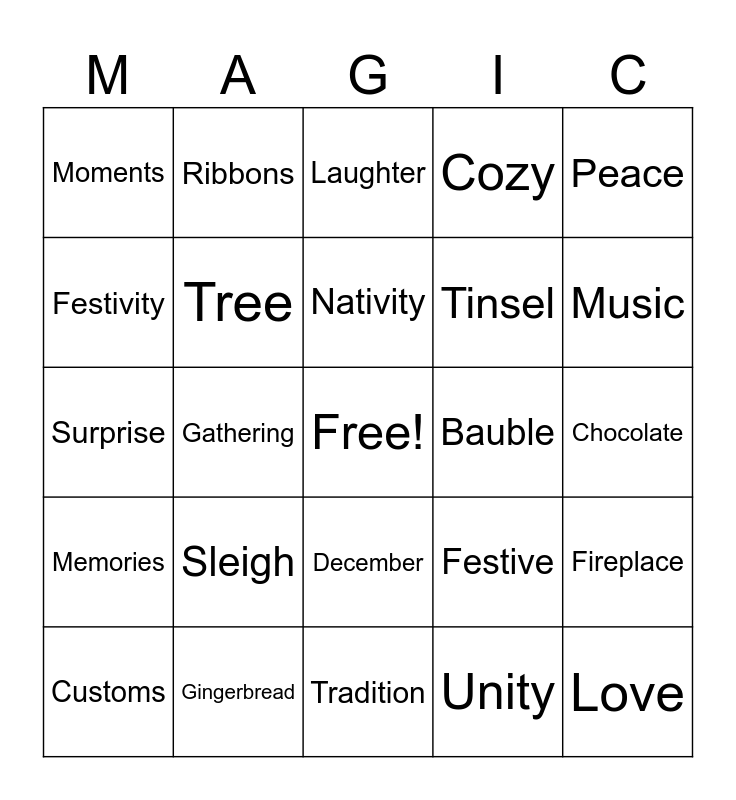 This bingo card has a free space and 100 words: Magic, Choir, Chocolate, Glow, Joy, Ornament, Season, Eve, Cheerful, Lights, Wreath, Snowflake, Luck, Gingerbread, Happiness, Wonder, Tinsel, Gratitude, Toffee, Bells, Friends, Cheer, Santa, Smiles, Jingle, Bauble, Peace, Festive, Snow, Giving, Gathering, Moments, Family, Carolling, Unity, Nativity, Fireplace, Holly, Holiday, Hope, Frost, Star, Surprise, Mistletoe, Music, Laughter, Bows, Stocking, Pine, Tradition, Baking, Celebration, Jinglebells, Reindeer, Pudding, Countdown, Presents, Carol, Gifts, Cozy, Songs, Chill, Treats, Jolly, Workshop, Christmas, Wrapping, Togetherness, Angel, Merry, Ivy, Sleigh, eggnog, Claus, Crib, Party, Snowman, Festivity, Blessings, Winter, Feast, Love, Midnight, December, Chimney, Ribbons, Cocoa, Warmth, Evergreen, Memories, Cheerfulness, Cookies, Spirit, Customs, Tree, Cake, Kindness, Miracle, Twinkle and Sparkle.