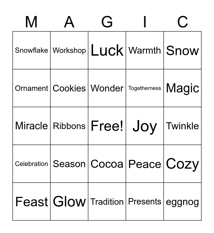 This bingo card has a free space and 100 words: Gifts, Cheerfulness, Twinkle, Unity, Family, Sparkle, Music, Merry, Frost, Reindeer, Songs, Pudding, Giving, Glow, Party, Cheer, Togetherness, Wrapping, Chimney, Ivy, Laughter, Cake, Choir, Moments, Holiday, Joy, Snow, Peace, Angel, Festivity, Ribbons, Snowflake, Treats, Happiness, Presents, Wonder, Cozy, Carolling, Winter, Fireplace, Claus, Cheerful, Miracle, Eve, Magic, Luck, Mistletoe, Wreath, Gingerbread, Tradition, Love, Spirit, Christmas, Bauble, Chill, Jolly, Gathering, Countdown, Midnight, Warmth, Bells, Toffee, Stocking, Gratitude, Star, Lights, Santa, Chocolate, Jinglebells, Sleigh, Pine, Season, Carol, Bows, Baking, Crib, Smiles, Ornament, Snowman, Customs, Blessings, eggnog, Tree, Cocoa, Festive, Workshop, Holly, Hope, Nativity, Celebration, Memories, Surprise, Friends, Feast, Cookies, Evergreen, Tinsel, Kindness, December and Jingle.