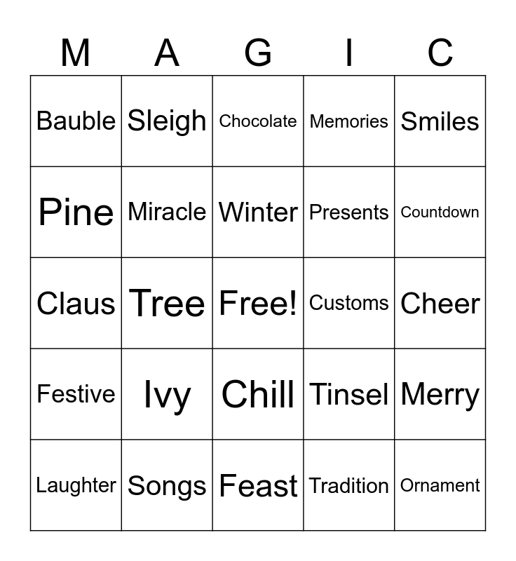 This bingo card has a free space and 100 words: Twinkle, Gratitude, Cheer, Gathering, Jingle, Toffee, Sparkle, Happiness, Giving, Cheerful, Party, Cookies, Magic, Songs, Moments, Evergreen, Presents, Snowflake, Gifts, Carolling, Family, Season, eggnog, Pudding, Holiday, Customs, Smiles, Tinsel, Choir, Surprise, Tree, Bauble, Angel, Chimney, Tradition, Winter, Merry, Lights, Jinglebells, Wreath, Eve, Crib, Claus, Midnight, Countdown, Chocolate, Bows, Christmas, Holly, Feast, Baking, Star, Frost, Stocking, Joy, Carol, Unity, Love, Snowman, Memories, Cocoa, December, Snow, Workshop, Togetherness, Jolly, Santa, Fireplace, Reindeer, Spirit, Music, Ivy, Glow, Mistletoe, Blessings, Gingerbread, Ribbons, Pine, Cozy, Festivity, Luck, Ornament, Friends, Chill, Wonder, Sleigh, Peace, Wrapping, Cake, Festive, Nativity, Celebration, Treats, Laughter, Miracle, Warmth, Cheerfulness, Hope, Kindness and Bells.