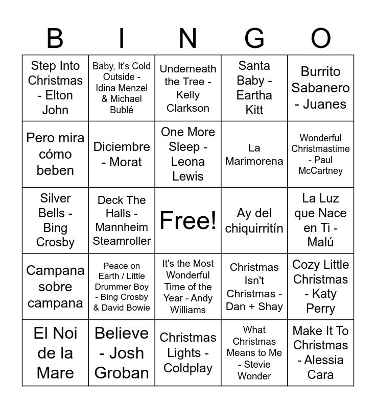 This bingo card has a free space and 99 words: All I Want for Christmas Is You - Mariah Carey, Last Christmas - Wham!, Santa Tell Me - Ariana Grande, Underneath the Tree - Kelly Clarkson, Snowman - Sia, Let It Snow! - Dean Martin, Jingle Bell Rock - Bobby Helms, It's Beginning to Look a Lot Like Christmas - Michael Bublé, Rockin' Around the Christmas Tree - Brenda Lee, Do They Know It's Christmas? - Band Aid, Merry Christmas - Ed Sheeran & Elton John, Christmas Tree Farm - Taylor Swift, Sleigh Ride - The Ronettes, It's the Most Wonderful Time of the Year - Andy Williams, Holly Jolly Christmas - Burl Ives, Step Into Christmas - Elton John, Baby, It's Cold Outside - Idina Menzel & Michael Bublé, Christmas (Baby Please Come Home) - Darlene Love, Happy Xmas (War Is Over) - John Lennon, White Christmas - Bing Crosby, Have Yourself a Merry Little Christmas - Judy Garland, Blue Christmas - Elvis Presley, Mistletoe - Justin Bieber, Let It Go (Christmas atmosphere!) - Idina Menzel, Like It's Christmas - Jonas Brothers, Cozy Little Christmas - Katy Perry, One More Sleep - Leona Lewis, Oh Santa! - Mariah Carey, Ariana Grande & Jennifer Hudson, My Only Wish (This Year) - Britney Spears, 8 Days of Christmas - Destiny's Child, Christmas Lights - Coldplay, What Christmas Means to Me - Stevie Wonder, The Christmas Song - Nat King Cole, Feliz Navidad - Michael Bublé ft. Thalía, Deck The Halls - Mannheim Steamroller, Silver Bells - Bing Crosby, Rudolph the Red-Nosed Reindeer - Gene Autry, Frosty the Snowman - Jimmy Durante, Little Saint Nick - The Beach Boys, Peace on Earth / Little Drummer Boy - Bing Crosby & David Bowie, River - Joni Mitchell, Wonderful Christmastime - Paul McCartney, Santa Baby - Eartha Kitt, Believe - Josh Groban, When Christmas Comes - Mariah Carey & John Legend, Christmas Time - Bryan Adams, You Make It Feel Like Christmas - Gwen Stefani & Blake Shelton, I Wish It Could Be Christmas Everyday - Wizzard, Driving Home for Christmas - Chris Rea, Mele Kalikimaka - Bing Crosby, Christmas Without You - Ava Max, Make It To Christmas - Alessia Cara, Christmas Isn't Christmas - Dan + Shay, Wish It Could Be Christmas Everyday - Leona Lewis, Christmas Time Is Here - Vince Guaraldi Trio, Winter Wonderland - Aretha Franklin, This Christmas - Donny Hathaway, Please Come Home for Christmas - Eagles, Every Christmas - Ariana Grande, Christmases When You Were Mine - Taylor Swift, Glow - Brett Eldredge, I Need You Christmas - Jonas Brothers, Oh Holy Night - Mariah Carey, Joy to the World - Whitney Houston, Feliz Navidad - José Feliciano, Burrito Sabanero - Juanes, Los Peces en el Río - Rosario, El Tamborilero - Raphael, Blanca Navidad - Luis Miguel, Campana sobre campana, Mi Burrito Sabanero - Oscar D'León, La Marimorena, Pero mira cómo beben, Noche de Paz - Matisse, Ven a mi casa esta Navidad - Luis Aguilé, Navidad, Navidad - Tatiana, Diciembre - Morat, Llegó la Navidad - Thalía & Banda El Recodo, Tengo que colgar - Raphael, Hacia Belén va una burra, Ay del chiquirritín, Un año más - Mecano, Santa Claus Llegó a la Ciudad - Luis Miguel, Navidad sin ti - Los Bukis, Canción para la Navidad - Rocío Dúrcal, Ya vienen los Reyes Magos, Rodolfo el Reno - Tatiana, Esta Navidad - India Martínez, La Luz que Nace en Ti - Malú, El Noi de la Mare, Fum, Fum, Fum, El Dimoni Escuat, El Rabadà, Santa Nit (Noche de Paz), La Pastora Caterina, A Betlem me'n vull anar, Les dotze van tocant, El desembre congelat and Ningú no estima com tu (Nadal) - Manel.