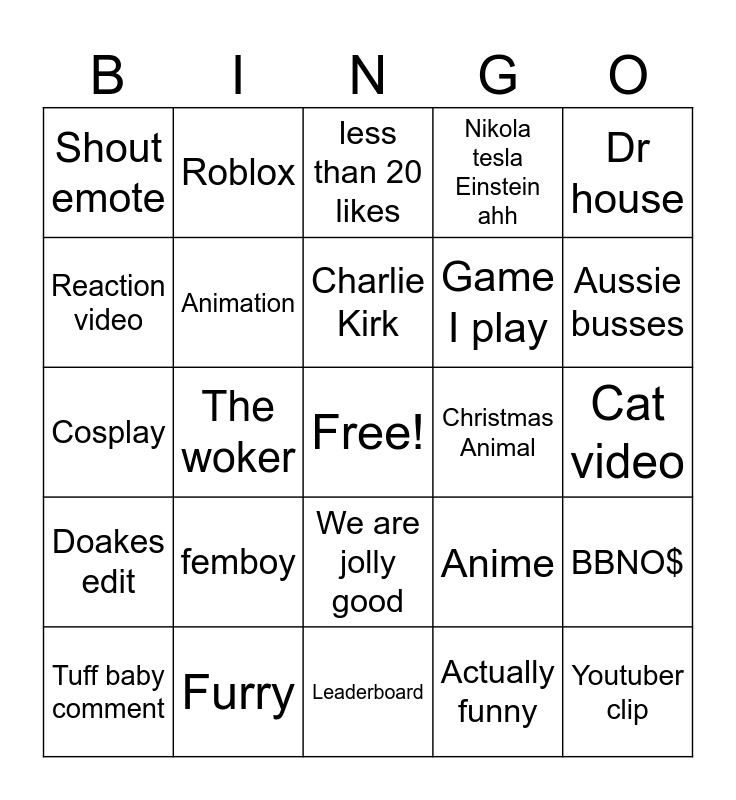 This bingo card has a free space and 24 words: femboy, Furry, Charlie Kirk, Tuff baby comment, Dr house, Shout emote, Reaction video, Roblox, Christmas Animal, We are jolly good, Game I play, Cosplay, Anime, BBNO$, Animation, Actually funny, Cat video, less than 20 likes, Aussie busses, The woker, Youtuber clip, Doakes edit, Nikola tesla Einstein ahh and Leaderboard.