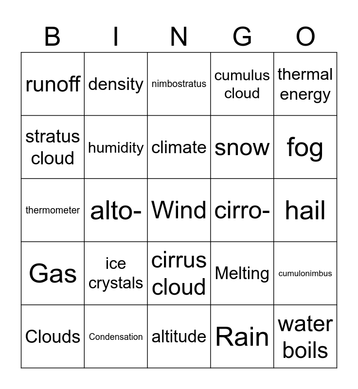 This bingo card has 35 words: water cycle, precipitation, evaporation, humidity, cirrus cloud, cumulus cloud, stratus cloud, weather, climate, sleet, thermometer, thermal energy, solar radiation, infiltration, runoff, cirro-, Rain, alto-, Gas, Wind, Melting, Clouds, cumulonimbus, Condensation, nimbostratus, fog, water boils, water freezes, snow, hail, Troposphere, altitude, ice crystals, density and strato-.