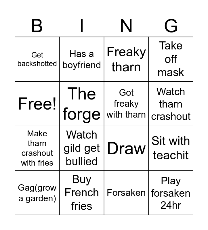 This bingo card has 16 words: Buy French fries, Sit with teachit, Freaky tharn, Get backshotted, Make tharn crashout with fries, Has a boyfriend, Draw, Forsaken, Free!, The forge, Gag(grow a garden), Take off mask, Watch gild get bullied, Watch tharn crashout, Got freaky with tharn and Play forsaken 24hr.
