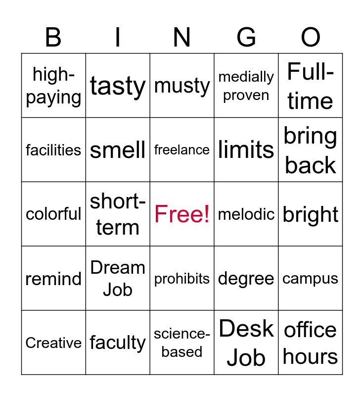 This bingo card has a free space and 24 words: Creative, Dream Job, freelance, Desk Job, Full-time, high-paying, tasty, musty, melodic, bright, colorful, smell, degree, campus, facilities, faculty, science-based, medially proven, bring back, remind, short-term, prohibits, limits and office hours.