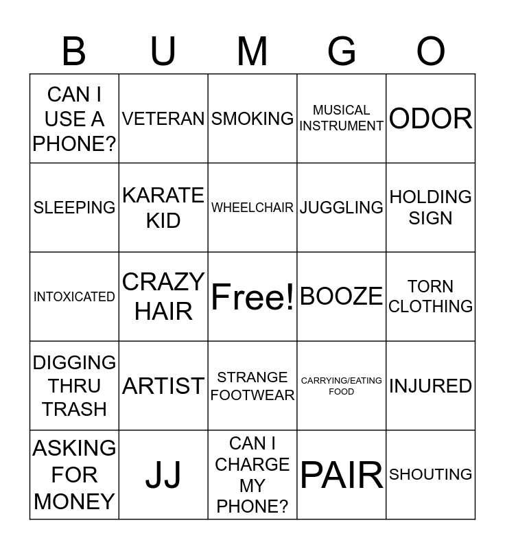 This bingo card has a free space and 24 words: ARTIST, JJ, WHEELCHAIR, ASKING FOR MONEY, ODOR, CAN I USE A PHONE?, SLEEPING, VETERAN, BOOZE, STRANGE FOOTWEAR, JUGGLING, INTOXICATED, CARRYING/EATING FOOD, INJURED, KARATE KID, PAIR, TORN CLOTHING, SMOKING, HOLDING SIGN, CRAZY HAIR, SHOUTING, DIGGING THRU TRASH, MUSICAL INSTRUMENT and CAN I CHARGE MY PHONE?.