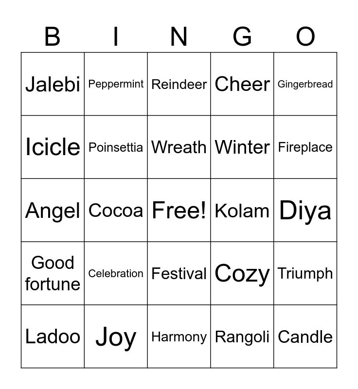 This bingo card has a free space and 75 words: Snowflake, Tinsel, Reindeer, Sleigh, Mistletoe, Evergreen, Stocking, Garland, Ornament, Nutcracker, Carol, Holly, Wreath, Icicle, Snowman, Cocoa, Bells, Candle, Elf, Gingerbread, Star, Angel, Poinsettia, Peppermint, Cheer, Yuletide, Fir, Noel, Sleighbell, Hearth, Snowfall, North Pole, Wrapping paper, Cozy, Fireplace, Winter, Jolly, Caroler, Diya, Rangoli, Lakshmi, Ganesha, Puja, Aarti, Sweets, Mithai, Ladoo, Jalebi, Fireworks, Sparklers, Lamps, Festival, Prosperity, Light, Tradition, Family, Blessings, Mandir, Incense, Oil lamp, Celebration, Diyas, Prayers, Crackers, Colors, Kolam, Festive, Gold, New beginnings, Triumph, Good fortune, Joy, Radiance, Harmony and Gratitude.