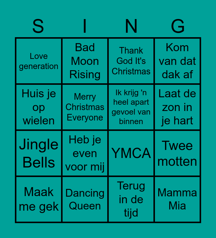 This bingo card has 28 words: Last Christmas, Jingle Bell Rock, Jingle Bells, All i Want for Christmas is You, Merry Christmas Everyone, Thank God It's Christmas, Bad Moon Rising, Mamma Mia, Dancing Queen, Johnny B. Goode, YMCA, Kom van dat dak af, Una Paloma Blanca, Ich bin wie du, Heb je even voor mij, Het kleine cafe aan de haven, Let's twist again, Ik krijg 'n heel apart gevoel van binnen, Laat de zon in je hart, Even aan mijn moeder vragen, Love generation, Rock around the clock, Maak me gek, Twee motten, Terug in de tijd, Zoet, Zout, Zuur, Huis je op wielen and Macarena.