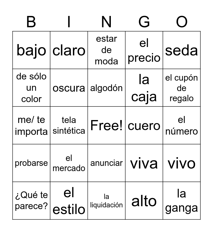 This bingo card has a free space and 52 words: la entrada, la ganga, el letrero, la liquidación, el mercado, la salida, claro, clara, de sólo un color, oscuro, oscura, pastel, vivo, viva, ¿De qué está hecho?, Está hecho de..., algodón, cuero, lana, seda, tela sintética, alto, bajo, la caja, el cajero, la cajera, el cheque, el cheque de viajero, el cupón de regalo, en efectivo, gastar, el precio, la tarjeta de crédito, apretado,, escoger, estar de moda, el estilo, exagerado, flojo, la marca, mediano, el número, probarse, la talla, anunciar, encontrar, en realidad, me/ te importa, inmediatamente, me parece, ¿Qué te parece? and recientemente.